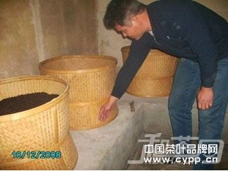 绿褐色的茶叶,条索外形极好的茶叶,质地蓬松的茶叶,用掌心稍稍一握觉得干燥的样子,其实不然,这些初焙过的茶叶在储存搬动过程中,又潜入了空气中的水份。这种水份你肉眼是感觉不到的。于是,茶叶每隔一段时间,就要拿出来回一回火。回火就是“回火焙”。“回火焙”的茶大都是精制茶,因此得特别小心。把茶叶摊放在篾制焙笼的隔筛上,隔筛留有许多细孔,炭火的力就是透过细孔直往上冲的。在隔筛上铺茶叶很讲究,不能铺得太厚实,要均匀地摊平。细心的做法是在茶叶底下垫一张毛边纸,这种毛边纸必须是竹浆捞制的,才不会有异味污染。这样可以防止茶叶碎末透过隔筛掉入焙坑中引起薰烟,薰烟上窜,影响了茶叶的原味,坏了整笼茶叶的韵味。焙坑里养着的炭火,火力不能让它太裸,必须用披刀将盖灰覆于炭火上。只有灰的厚薄可以调整炭火的强弱。